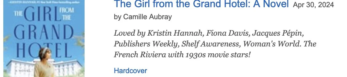 Just want to share with you some happy thoughts at this time of year. First, I'm thrilled that the hardcover edition of my latest novel, THE GIRL FROM THE GRAND HOTEL is now available as an Amazon "Best Deal" for a special price, but only for the next twelve days! That makes it a great gift for for those you love, so that you can get a jump on the end-of-year holiday gift-buying. Here's the link to this special Amazon price: https://www.amazon.com/Girl-Grand-Hotel-Camille-Aubray/dp/B0CGJMNF3G